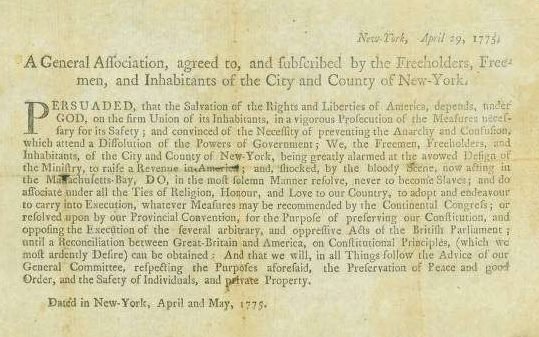 “Persuaded, that the Salvation of the Rights and Liberties of America, depends, under GOD, on the firm Union of its Inhabitants, in a vigorous Prosecution of the Measures necessary for its Safety; and convinced of the Necessity of preventing the Anarchy and Confusion, which attend a Dissolution of the Powers of Government; We, the Freeholders and Inhabitants of [Huntington] being greatly alarmed at the avowed Design of the Ministry, to raise a Revenue in America: and, shocked by the bloody Scene, now acting in the Massachusetts Bay, DO, in the most solemn Manner, resolve, never to become Slaves; and do Associate under all the Ties of religion, Honour, and Love to our Country, to adopt and endeavor to carry into Execution, whatever Measures may be recommended by the Continental Congress; or resolved upon by our Provincial Convention, for the Purpose of preserving our Constitution, and opposition the Execution of the several arbitrary, and oppressive Acts of the British Parliament; until a Reconciliation between Great-Britain and America, on Constitutional Principles, (which we most ardently Desire), can be obtained; And that we will in all Things follow the Advice of our General Committee, respecting the Purposes aforesaid, the Preservation of Peace and good Order, and the Safety of Individuals, and private property.”