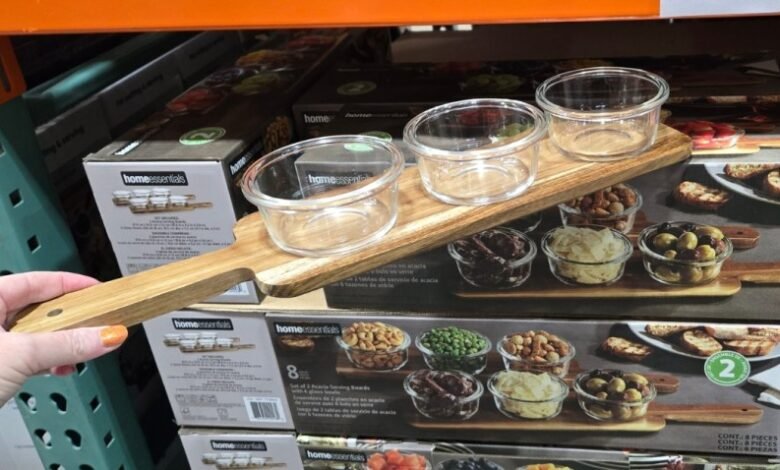 hand holding a box with a wooden serving board with 3 glass bowls, boxes of them behind it on a Costco shelf
