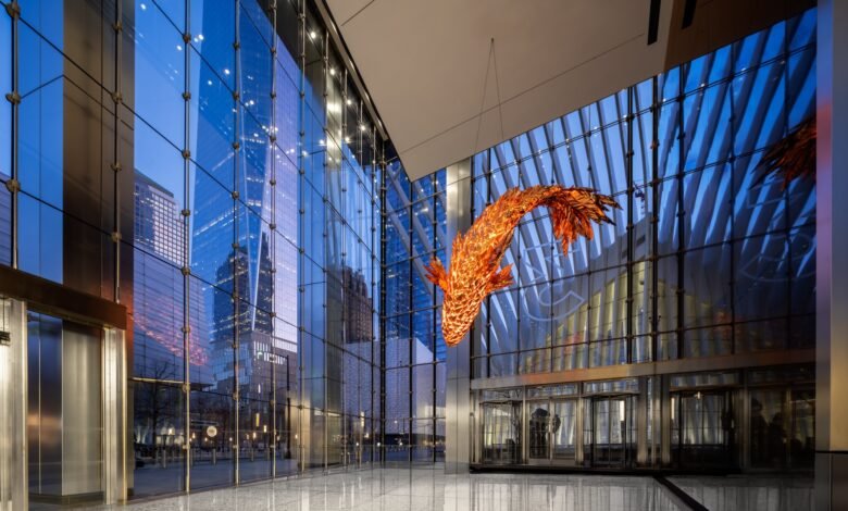 A fish sculpture by Frank Gehry now hangs in the lobby of 3 World Trade Center