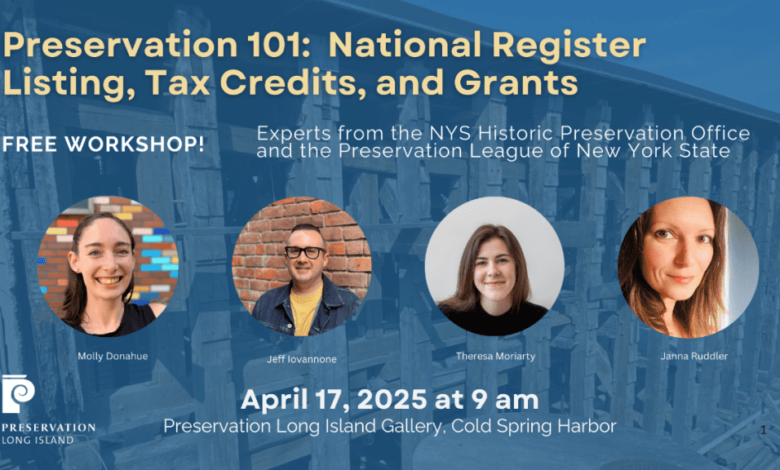 On April 17, 2025 from 9 am until 4 pm Preservation Long Island will host an historic preservation workshop with experts from the New York State Historic Preservation Office (State Parks) and the Preservation League of New York State.