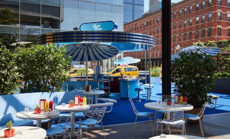 The Standard, High Line has turned its plaza under the High Line into an open-air retro diner for the summer. As the latest seasonal pop-up at the Meatpacking District hotel, The Soda Shop will serve up a nostalgic experience, with an Americana-inspired design and a menu that includes diner classics, like flapjacks, tuna melts, and soda floats, as well as fun cocktails, like a frozen dirty Shirley and pickle martini.