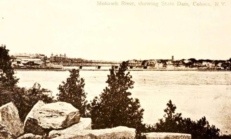 Illustrations, from above: “Mohawk River Showing State Dam, Cohoes” showing where the Champlain Canal crossed the Mohawk by a slackwater pool created by the State Dam (Cohoes, with its Harmony Mills in the background, is to the left, the outskirts of Waterford are to the right); and a 1910 Sanborn Insurance map of Cohoes, annotated by the author.
