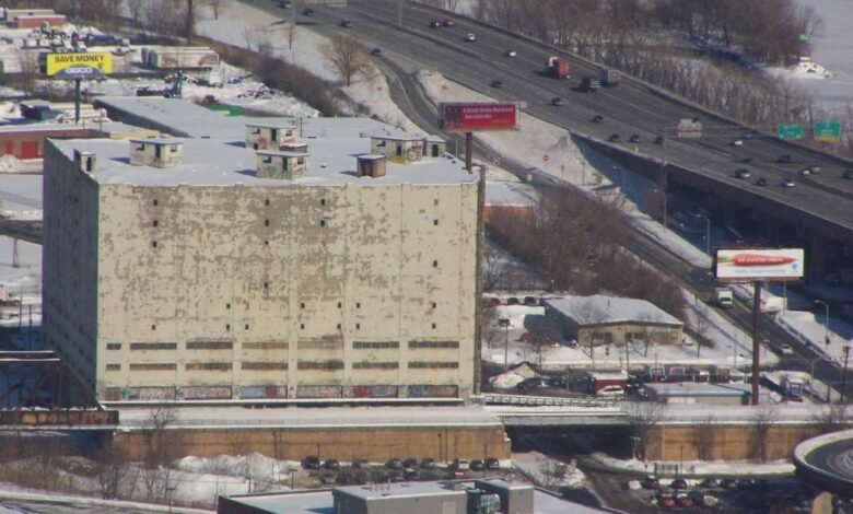 The 11-story building was built in 1927 by the New York Central Railroad and includes a two track spur entering the second floor; the walls are three-foot-thick concrete. The refrigeration systems used potentially toxic ammonia.