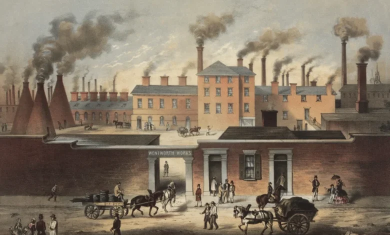 Illustrations, from above: The well-guarded Wentworth Works steel factory in Sheffield, England, 1860; Portrait of Marc Isambard Brunel by James Northcote, 1813; A trade card of instrument maker J.M. Hyde, Bristol, 1841-55; An 1809 edition of Hamilton’s ‘Report on Manufactures,’ 1791; James Sullivan Lincoln’s Portrait of Samuel Slater, date unknown (Brown University, Providence); Jedediah Strutt’s textile mill at Belper, Derbyshire diagram showing the construction, waterwheel and line shafts; and the Slater Mill in Pawtucket, Rhode Island, around 1897.