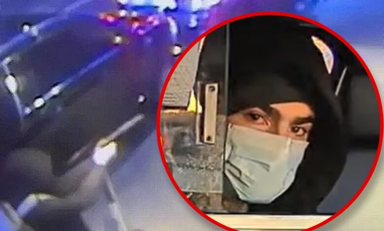 The alleged gunman is peeking through a window divider and staring directly into a security camera mounted inside the taxi. He is wearing a blue medical mask that covers his nose and mouth while his eyes and brows are totally exposed.