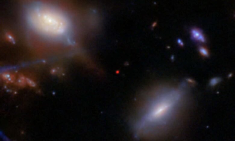 The distant galaxy JADES-GS-z13-1-LA appears as a red dot in this image from the James Webb Space Telescope