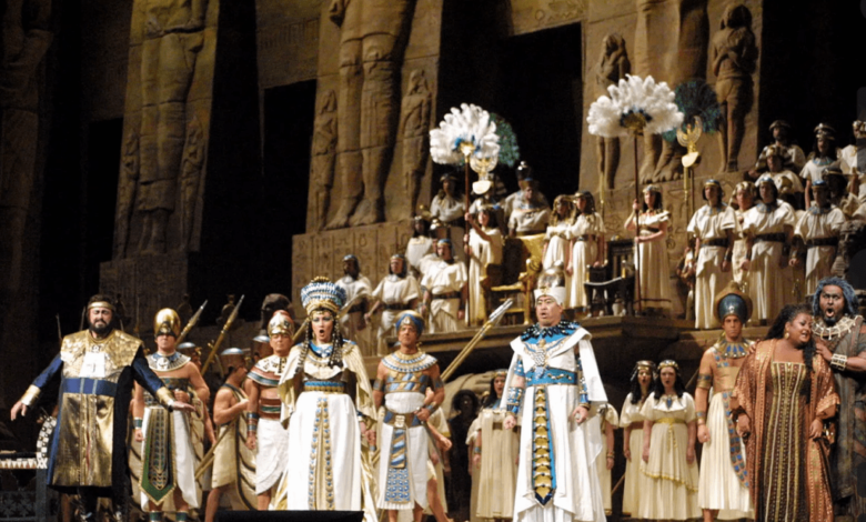 Illustrations, from above: Luciano Pavarotti (far left) performing in Giuseppe Verdi’s Aida with the Metropolitan Opera, New York City, 2001; Dominick Lynch II, wine merchant, bon vivant and opera lover; Anonymous, Giuditta Pasta as Desdemone in Rossini’s Othello; Interior of Manhattan’s Park Theatre in 1822 (Performing Arts Archive); Henri Decaisne, Portrait of Maria Malibran, 1831 (Musée Carnavalet, Paris).