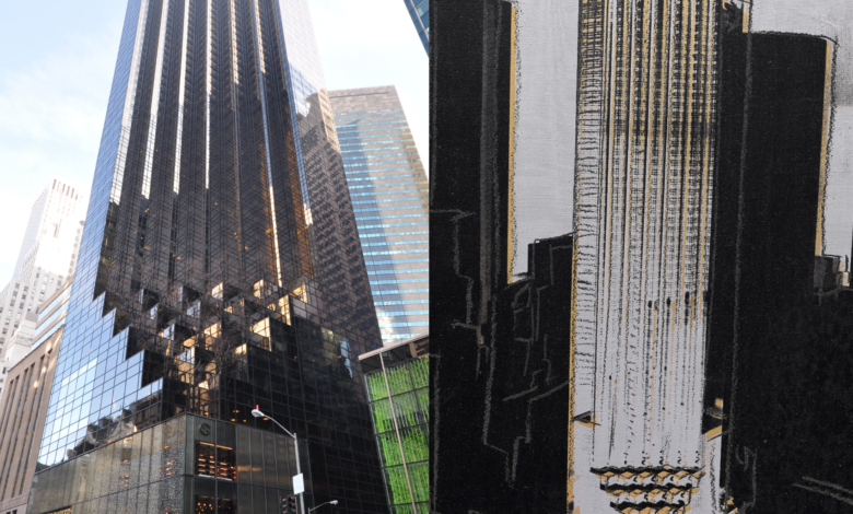 Left: Trump Tower via WikiCommons. Right: Andy Warhol’s “New York Skyscrapers,” courtesy of Phillips.