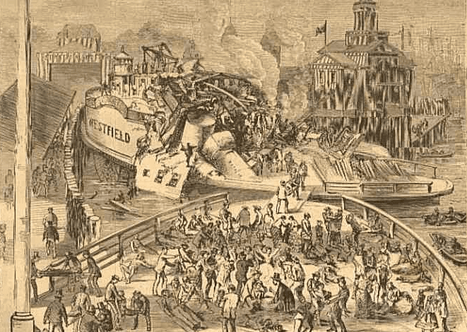 About half past one Sunday afternoon, July 30, [1871] the Staten Island ferry boat Westfield was lying quietly in her slip at the foot of Whitehall Street, New York. Over four hundred souls were on board, lured by the delightful weather from their crowded homes to breathe the pure sea air and enjoy the grass and shade of the uncontaminated country.