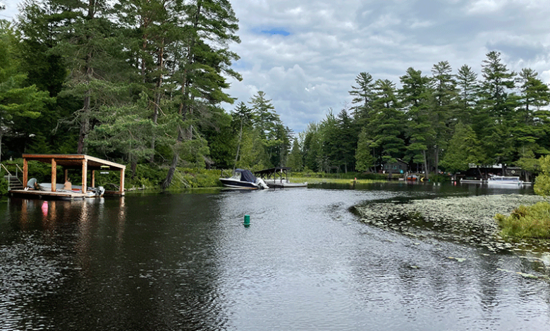 Photos show the channel between Upper Saranac Lake and the Fish Creek Ponds. This channel is heavily traveled by motorboats and canoes and kayaks (provided by Protect the Adirondacks).