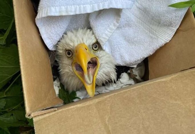 The angler who reported the injured bird to DEC provided the ECOs with towels to help safely secure the eagle while Officers Curinga and Swan contacted Officer Willson for additional assistance. ECO Willson arrived a short time later with a box to transport the eagle, which was taken to the Friends of the Feathered and Furry rehabilitation center in Greene County for treatment.