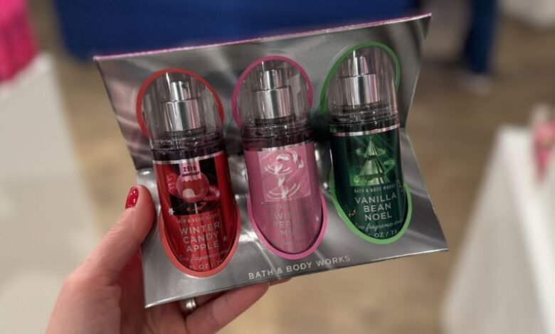 This trio includes three 2.5oz fragrance mists in Winter Candy Apple, Twisted Peppermint, and Vanilla Bean scents.