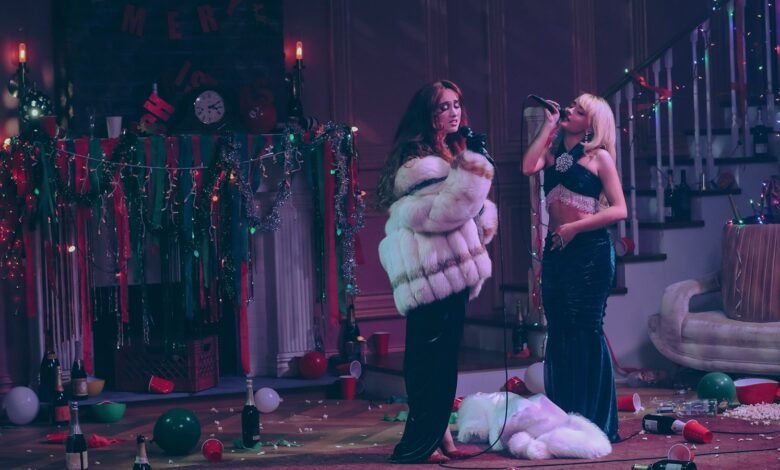 Here’s the Nonsense Christmas collab everyone will be the most jolly about. Chappell Roan and Carpenter come down the stairs in evening gowns and fur coats, singing karaoke to Wham!’s “Last Christmas.” The living room lights are off and there are red cups, bottles, and confetti littering the floor, making this the Christmas afterparty of the century. There’s little dialogue here, except for later, when Roan looks at her elegant outfit and says, “I look so… straight.” That’s all, ladies and gentlemen.
