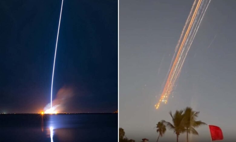 New Glenn reached orbit (left) but Starship exploded, raining debris (right)