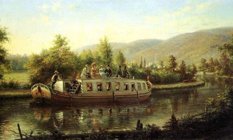 Illustration: “Early Days of Rapid Transit” by Edward Lamson Henry showing a canal packet boat ca. 1840s (Private collection).