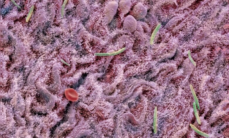 The intestinal lining of a mouse, with several bacteria (green) and one red blood cell (red)