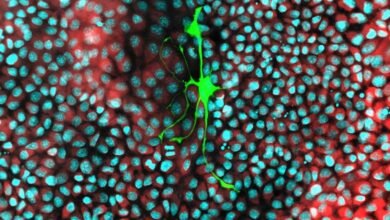 A nerve cell (stained green) growing among a cancer cell culture Simon Grelet and Gustavo Ayala Cancer cells steal energy-generating…