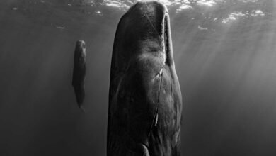 Suspended Grace: A sleeping sperm whale and her calf Paul Nicklen With a full belly – look closely and you…