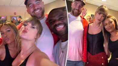 Taylor Swift and Travis Kelce pose with pals inside suite after Chiefs’ win