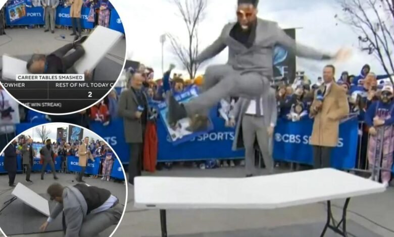 With a rowdy collection of Bills Mafia members watching behind the set, four members of the “NFL Today” crew jumped through folding tables — a traditional pregame move from Bills fans — during the CBS pregame show ahead of Buffalo’s Chiefs clash Sunday afternoon.