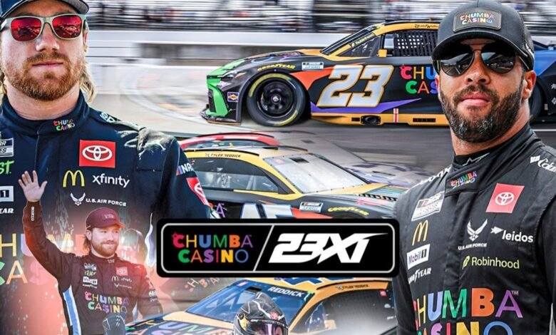 A promotional collage from 23XI Racing highlights its ongoing relationship with Chumba Casino. The online sweepstakes casino will have its branding wrapped on Tyler Reddick and Bubba Wallace’s cars during select NASCAR races this season. (Image: 23XI Racing)