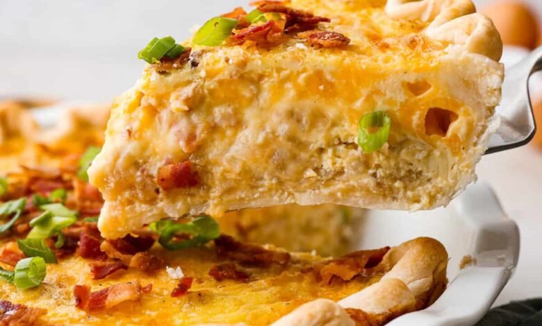 - Assemble: Add the onions, bacon, and cheese to the bottom of the pie crust.