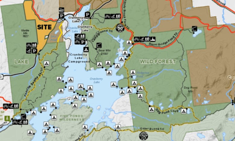 The 25,671-acre Cranberry Lake Wild Forest is made of four parcels to the west, northwest, and east of Cranberry Lake; it contains 6.2 miles of administrative roads, 26.9 miles of foot trails, 9.3 miles of snowmobile trails, 12.6 miles of ski trails, a 0.4-mile canoe carry, and three Adirondack lean-tos.
