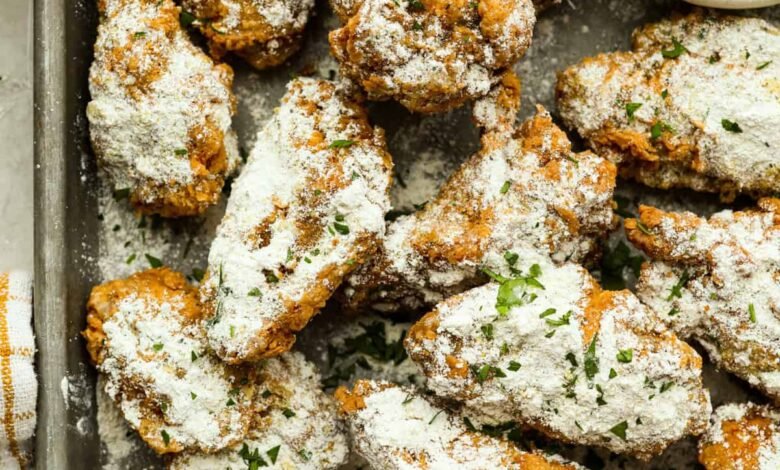 - Heat Oil and Mix Breading: Fill a deep fryer or heavy pot with vegetable or canola oil and heat to 325–375ºF. In a medium bowl, combine flour, cornstarch, lemon pepper, garlic powder, onion powder, and ranch seasoning.