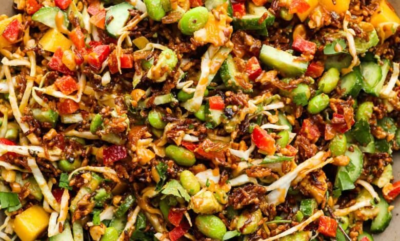 - Assemble the Salad: Add the cooled, crispy rice, shredded cabbage, red bell pepper, Persian (mini) cucumbers, avocado, edamame, mango, cilantro, peanuts, green onions, and mint to a large serving bowl. Drizzle with the dressing and toss to combine. Serve immediately