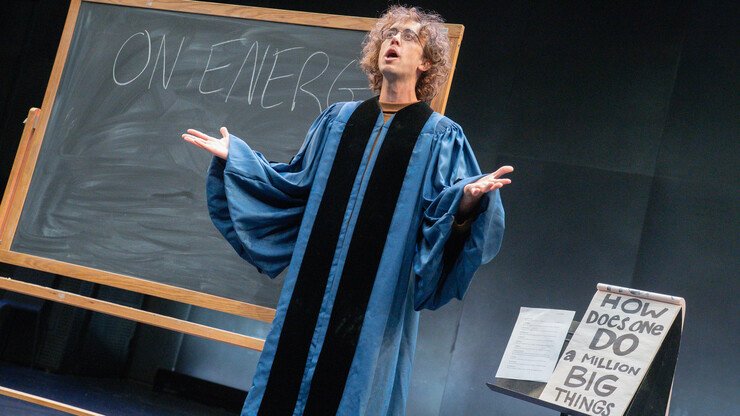 A man in a blue graduation gown standing in front of a black board.