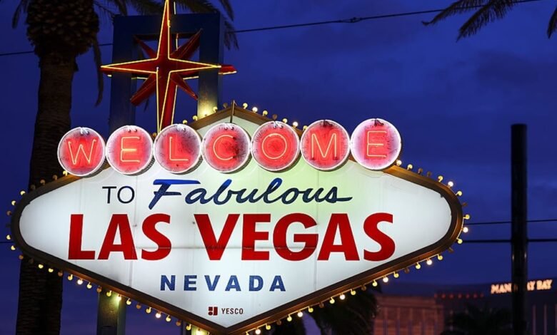 The sign sits on a median between the northbound and southbound lanes of Las Vegas Boulevard South, and while there is a paved pedestrian walkway leading up to it, pedestrians routinely cross multiple lanes to reach the spot because the nearest legal crossings aren’t always obvious.