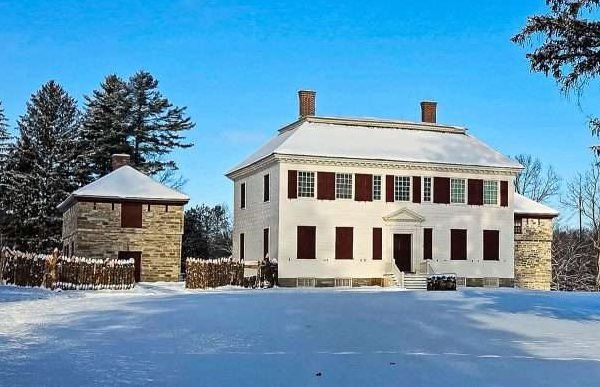 Illustrations, from above: Johnson Hall in Winter, and replica stockade fortifications surround Johnson Hall State Historic Site (Courtesy State Parks).
