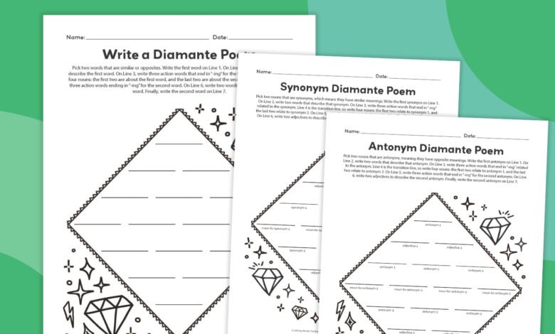 These diamante poem worksheets help students practice synonyms, antonyms, and parts of speech by building a seven-line diamond-shaped poem using nouns, adjectives, and “-ing” verbs.