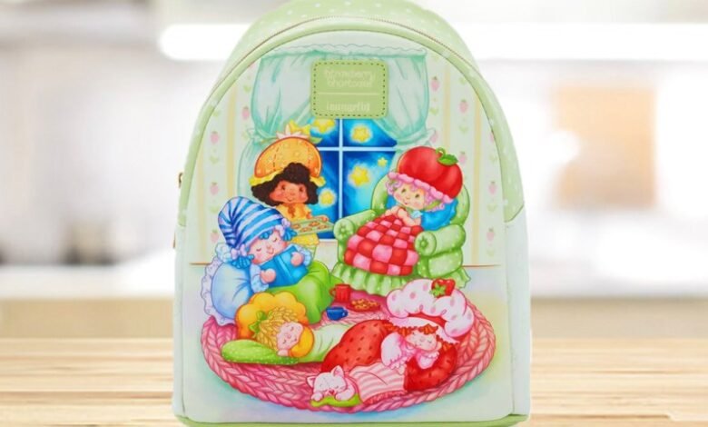 green strawberry shortcake backpack on countertop