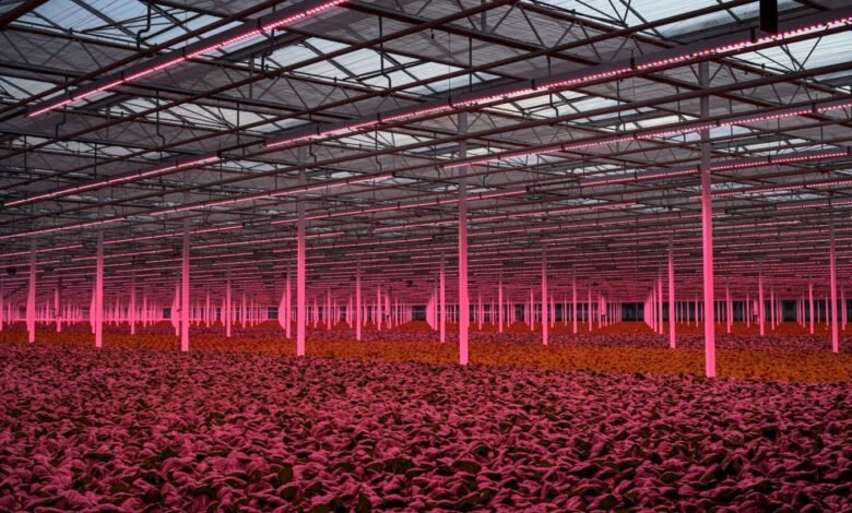 Bathed in a ghostly purple-red light, these floating lettuces are barely distinguishable from those grown outdoors, but require one-tenth as much land. The high-tech greenhouse where they live, in Maasbree in the Netherlands, is one possible remedy for a global food industry in crisis, facing a shortage of land due to climate change and conflict.