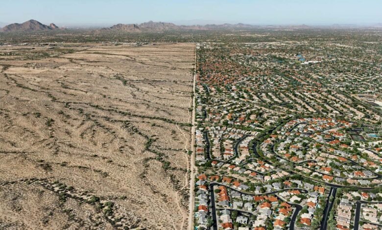 The Indigenous Pima and Maricopa peoples used to farm this land; it was turned into this comfortable conurbation in the 2000s. Valley settlements like this one depend on an increasingly complex and costly water-management system.