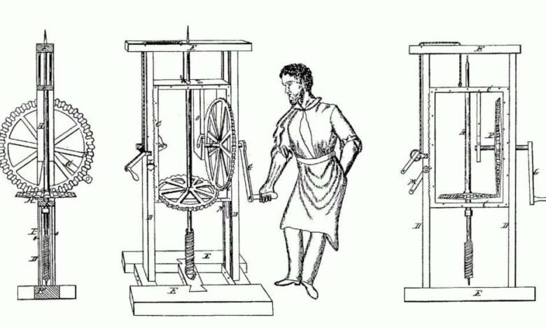 The book Repertory of Patent Inventions (1829) describes the tool: “A frame is made having two uprights, like those of a standing press. A cylindrical vertical shaft fits and turns freely in holes at the top and bottom of the sliding frame; the augers or bits, with which the boring is to be performed, are adapted to the lower end of the shaft. By means of a handle, motion is given to the vertical wheel.”