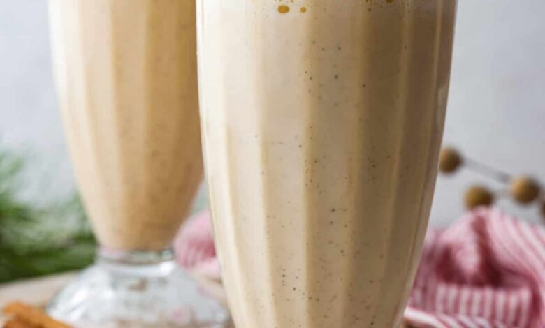 - Blend: Blend on high speed until smooth and creamy. Pour into serving glasses, add a cute straw, and top with whipped topping and a dusting of freshly grated nutmeg before serving.