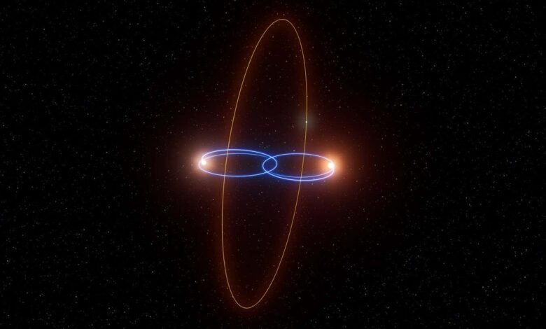 artist's impression of the exoplanet 2M1510 (AB) b's unusual orbit around its host stars