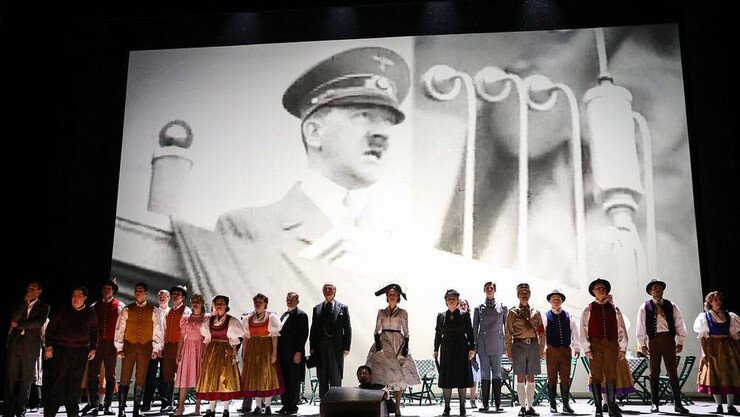A row of actors standing on stage with a photo of Hitler behind them on the screen.