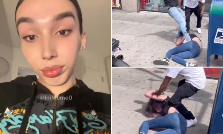 The man then punches the trans woman in the face, and when she tries to run away, a second man charges up and bashes her head.