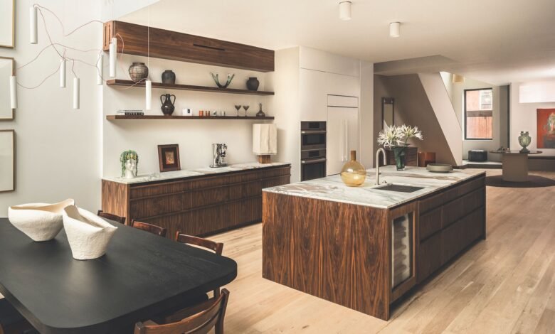 On the home’s lowest floor, a dramatic open kitchen features Wolf, Sub-Zero, Bosch, and LG appliances, framed by bespoke walnut millwork and statement Calacatta Vagli Oro marble. At the rear, a landscaped private garden extends the light-filled interior outdoors.