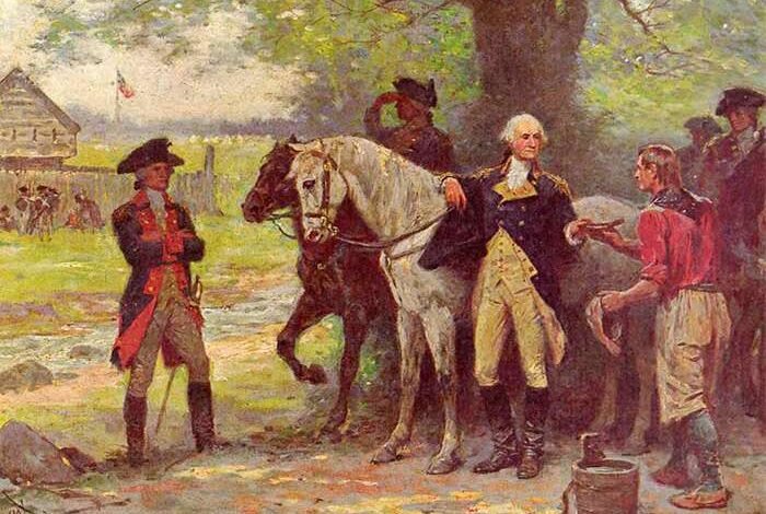 Illustrations, from above: Hovey Pond in Queensbury at Half-Way Brook and Fort Amherst (courtesy Queensbury Parks & Recreation); the original Half-Way Brook monument as it was installed in 1905; the rebuilt Half-Way Brook monument at Hovey Pond photographed by John Farrell, April 27, 2009; Jean Leon Gerome Ferris (1863-1930), “Washington at Halfway Brook,” 1895-1913 ” depicting “Fort Amherst” at the time of his 1783 trip to Northern New York, commissioned by the Glens Falls Insurance Company (Chapman Historical Museum); and French and Indian Wars Forts in Hudson Champlain and Lake George corridor (Warfare History Network).