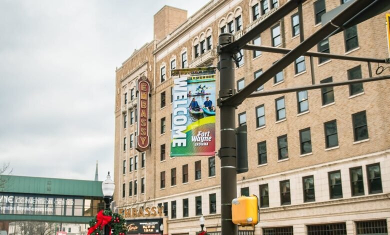 A “Welcome to Fort Wayne” streetlight banner is seen in downtown Fort Wayne on Jan. 2, 2025. Indiana legislation to allow a casino in Fort Wayne or somewhere near the city is advancing in the General Assembly. (Image: Visit Fort Wayne)