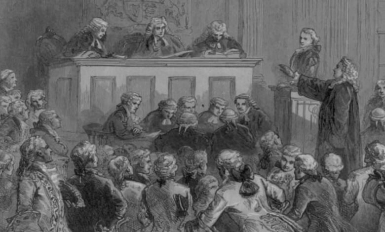 Illustration: Andrew Hamilton defending John Peter Zenger in court, 1734-5 (Library of Congress).