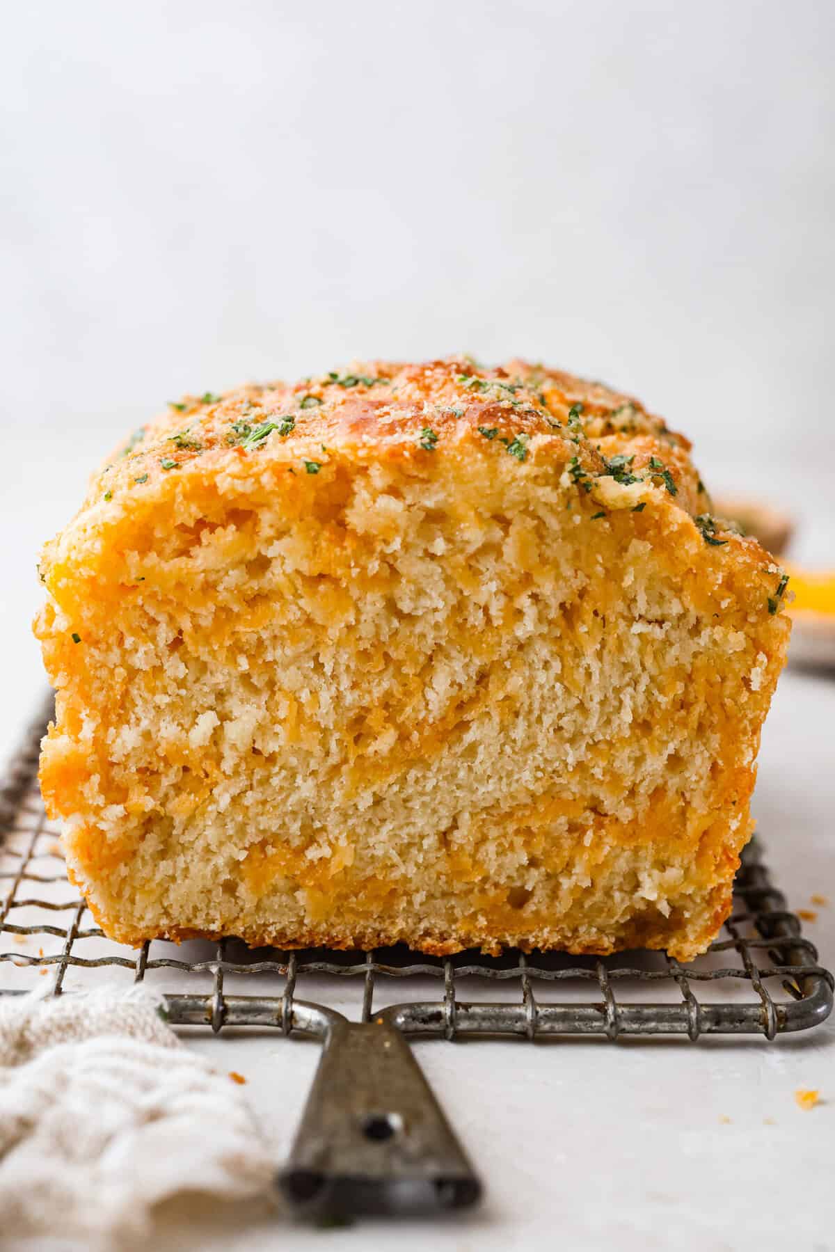 - Easy, Reliable Loaf: one bowl, one bread pan, no shaping. It bakes up tender with plenty of cheesy bites throughout.