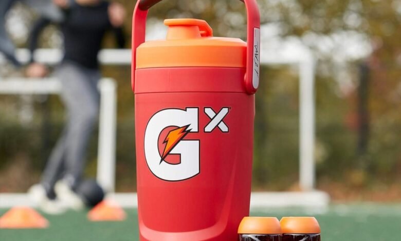 a blue Gatorade Gx large Jug with handle sitting on a soccer field, 2 Gx Pods next to it