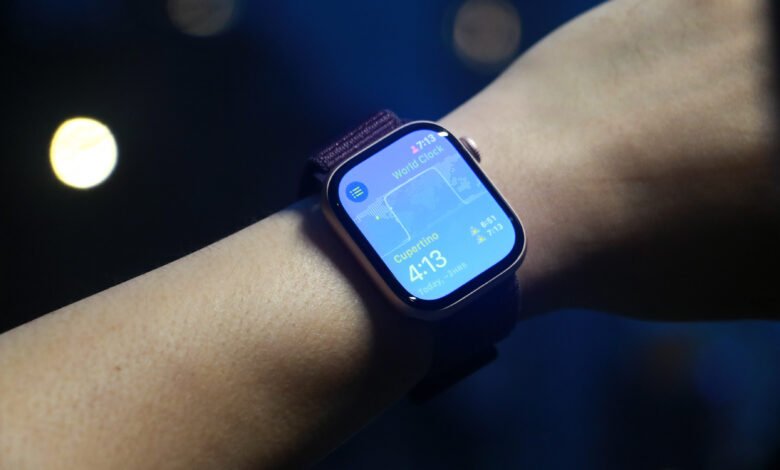 A person wears the Apple Watch Series 10 on their wrist. It shows a blue screen with the time and other widgets.