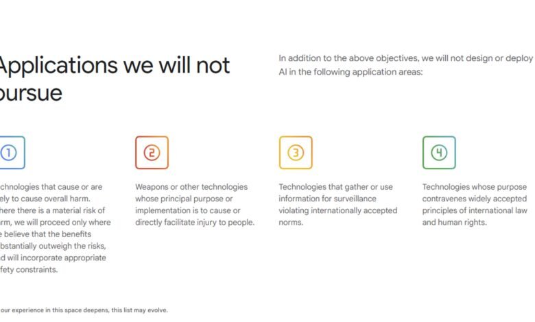 Instead, there's now a section titled "responsible development and deployment." There, Google says it will implement "appropriate human oversight, due diligence, and feedback mechanisms to align with user goals, social responsibility, and widely accepted principles of international law and human rights."