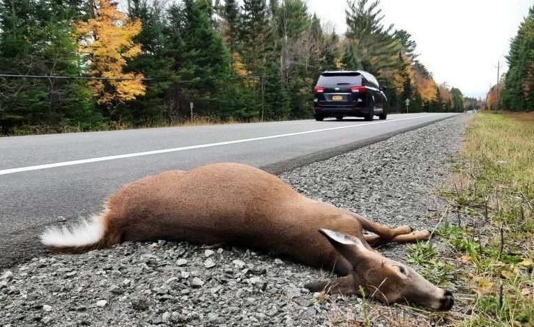 Photo: Whitetail deer killed by automobile collision on NYS Route 30 near Tupper Lake in October, 2024 (photo by Justin Levine of the Adirondack Council).